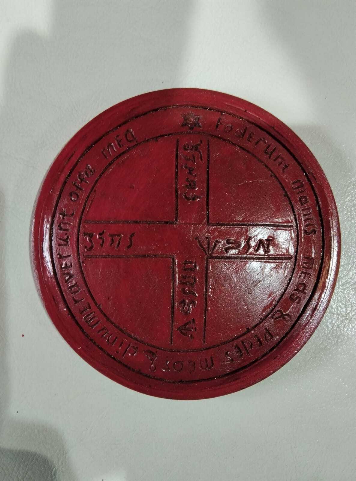 Сей пентакль имеет большую силу предохраняя хранителя от всяческих опасностей. Его нужно внимательно рассматривать и набожно изучать в таком положении, чтоб слово "Foderunt" было вверху. Изготовлен из бетоно-керамики с добавлением серебра для сохранения свойств.